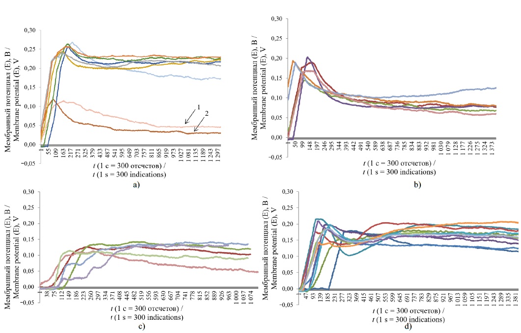 4. Fig. 3. Experimental graphs of membrane potential changes over time: a, b – graphs of wheat seeds of the “Granni” variety for the separation speeds 9 and 10 m/s; c, d – graphs of wheat seeds of the “Tasos” variety for the separation speeds 9 and 10 m/s