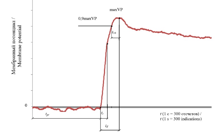 5. Fig. 4. Phases of membrane potential change: tpr – the time interval of the resting potential; td – the time interval of depolarization of the grain shell; tr– the time interval of a linear increase in VP; t10 – 10% of the rise time of the VP from the value of 0.9maxVP to maxVP; maxVP – maximum value of variable potential (VP)