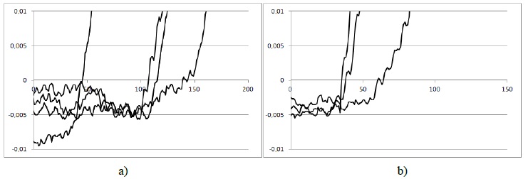 6. Fig. 5. Change in the membrane potential of wheat grains: a) variety “Tasos”, 9 m/s; b) variety “Granni”, 9 m/s