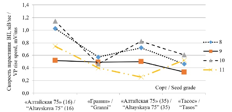 Скорость нарастания ВП характеризует проницаемость оболочек для ионов Na+. Чем выше проницаемость, тем больше ионов Na+ и ниже урожайность. Незначительное изменение ВП от урожайности свидетельствует о равнозначных свойствах оболочек у зерен различных сортов. Значит, можно предположить, что зерна из фракции 9 м/с потенциально имеют высокие урожайные свойства по сравнению с другими фракциями. Исследователи тоже отмечают, что зерна пшеницы из фракций 8-9 м/с отличаются хорошими урожайными свойствами [12].