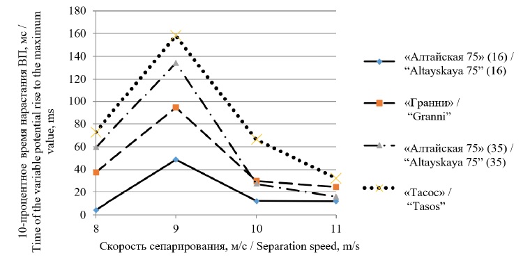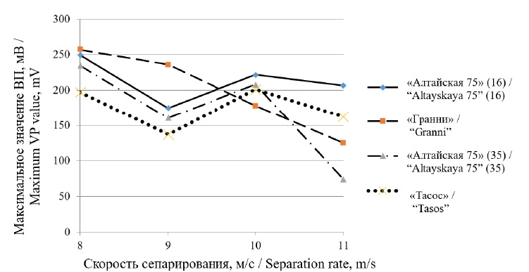 При сопоставлении зависимости массы 1 000 зерен от аэродинамических свойств у сорта «Гранни» обнаружен аномальный эффект. При скорости сепарирования 9 м/с масса 1 000 зерен меньше, чем масса 1 000 зерен при скорости сепарирования 8 м/с. Аномальные свойства проявляются при исследовании скорости нарастания ВП при скорости сепарирования 9 м/с (рис. 6) и при исследовании максимального значения ВП при той же скорости сепарирования 9 м/с (рис. 10). Уровень максимального значения ВП гораздо выше, чем у остальных сортов, что говорит о высокой концентрации ионов Na+.