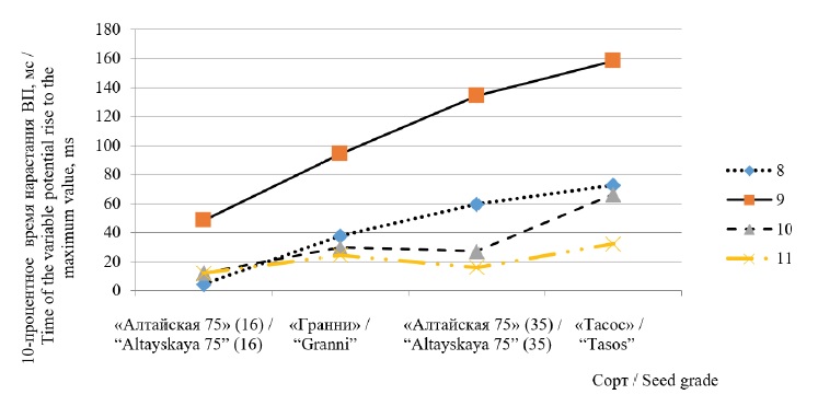 Результаты исследования 10-процентного времени нарастания ВП показали максимальную корреляцию с урожайными свойствами зерен пшеницы для всех сортов. С увеличением урожайности 10-процентное время нарастания увеличивается. Для зерен из фракции 9 м/с коэффициент линейной корреляции составил 0,98. Для зерен из фракции 8 м/с – 0,97. Зависимости отражены в линейных уравнениях (9) и (10). Увеличение 10-процентного времени нарастания ВП в фазе деполяризации характеризует уменьшение скорости проницаемости оболочек для ионов Na+. Меньшую скорость изменения проницаемости имеют зерна с высокой урожайностью.