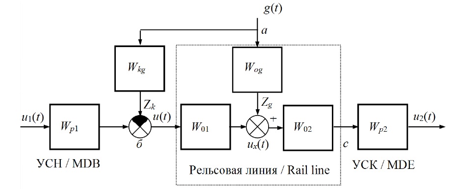 В выражении (5) передаточные функции W02 и Wp2(p) не могут быть равны нулю, т. к. они представляют собой передаточные функции рельсового четырехполюсника и физического устройства согласования в конце рельсовой линии. Другими словами, если W02(p) = 0 или Wp2(p) = 0, то передаточная функция основного сигнала превращается в нуль (Wu1(p) = 0) и, согласно уравнению (1), информативный сигнал u2(t) не отражает сигнал опроса рельсовой линии u1(t).