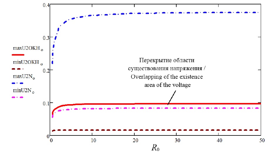 На рис. 6 представлены результаты исследований схемы U2 = f(g) с корректирующим звеном, преобразующим воздействие возмущения g(t) в компенсационный сигнал, с использованием математического программного пакета Mathcad в виде совмещенных областей существования напряжений – в классах нормального и – шунтового режимов.