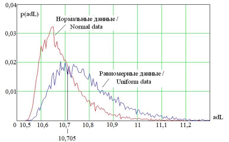 При значении порога квантования 10,705 совпадают значения вероятностей ошибок первого и второго рода: P1 = P2 = PЕЕ = 0,32. Значение данной величины меньше аналогичного значения нейросетевой реализации классической формы Андерсона – Дарлинга (2). Кроме того, данные две формы нейронов имеют в своих откликах независимые составляющие: corr(ad2, adL) = 0,644. Фактически мы имеем два разных статистических критерия, дополняющих друг друга.