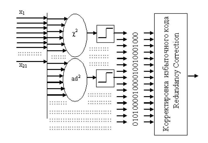 Принципиально важным является то, что на данный момент созданы десятки различных статистических критериев, то есть длина выходного избыточного кода нейронной сети (рис. 4) достаточно велика. Если подавать нормальные данные на нейронную сеть, она будет откликаться кодами с большинством нулевых разрядов, то есть корректоры редких ошибок избыточных кодов оказываются достаточно примитивными. При их создании может быть использован опыт разработки подобных корректоров кода для биометрических приложений [5–8].
