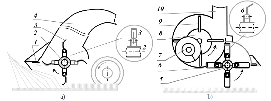 2. Fig. 1. A traditional flail forage harvester (a) and a flail forage harvester with a blower (b): 1 ‒ shearbar; 2 ‒ rotary cutter; 3 ‒ throwing knife; 4 ‒ discharge pipe; 5 ‒ rotary cutter; 6 – L‒ shape knife; 7 ‒ auger; 8 ‒ blower; 9 ‒ blower blade; 10 – discharge pipe