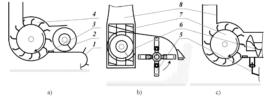 3. Fig. 2. A double chop forage harvester with a rotary cutter and with a flywheel cutterhead on the left side (a) and on the top (b): 1 ‒ rotary cutter; 2 ‒ L-shape blades; 3 ‒ flywheel cutter-head; 4 ‒ blades of a flywheel cutterhead; 5 ‒ throwing paddles of a flywheel cutterhead; 6 ‒ auger; 7 ‒ a shearbars; 8 ‒ flywheel cutterhead casе and discharge pipe