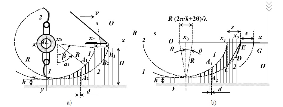 5. Fig. 4. Low plants cutting (a) and cutting of high plants, whose height is greater than the distance from the axis of the rotor to the base of the plants (b): 1, 2 − trajectories of knife tips 1 and 2; A1A2, B1B2, CE, DE, EG – plant cuts after cutting by knife; Oxy – fixed orthogonal Cartesian coordinates with horizontal axis Ox and vertical upward axis Oy; k – number of knives in the plane of rotation; h – minimal height of the stems after cutting; H – height of the stems before cutting; R ‒ radius of a rotor; d – step in the Ox direction; s – distance between neighboring trajectories of knives along an axis Ox; θ – angle (parameter); ω ‒ angular velocity of the rotor; v ‒ speed of the rotor axis point along an axis Ox; λ ‒ kinematic parameter (λ = Rω/v); x1, y1 – x, y coordinates of the point of the blade 1; x2, y2 – x, y coordinates of the point of the blade 2; β – angle (parameter); α1 – angle (parameter); x0, xe ‒ additional values