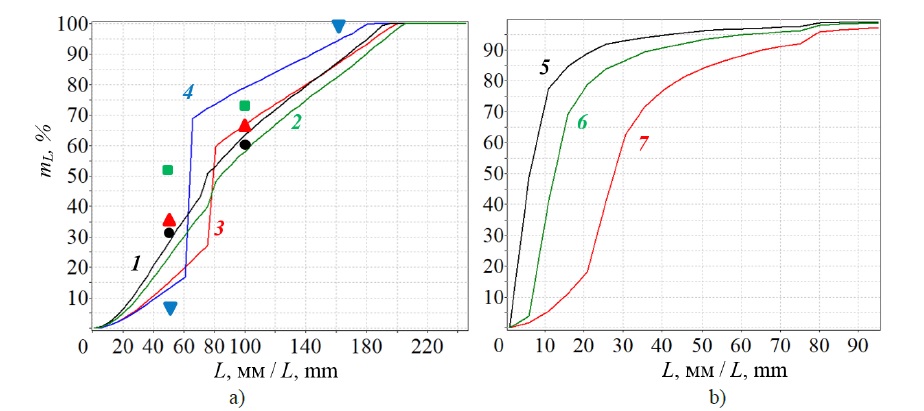 7. Fig. 6. The effect of L on mass fraction mL of plant particles, the length of which does not exceed L, after chopping by a rotary forage harvester (a) and a double chop forage harvester (b): 1 – (H – h) = 367 mm, s = 71 mm; ● – experimental data for alfalfa; 2 – (H – h) = 377 mm, s = 80 mm; ■ – experimental data for alfalfa; 3 – (H – h) = 660 mm, s = 76 mm; ▲ – experimental data for alfalfa with oats; 4 – (H – h) = 1001 mm s = 63 mm; ▼ – experimental data for sainfoin; 5 – (H – h) = 660 mm, s = 76 mm, lc = 5 mm; 6 – (H – h) = 660 mm, s = 76 mm, lc = 10 mm; 7 – (H – h) = 660 mm, s = 76 mm, lc = 25 mm