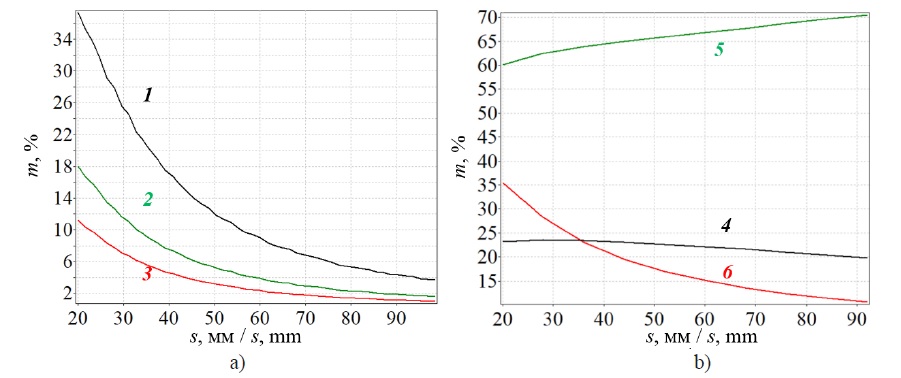 8. Fig. 7. The effect of s on mass fraction of plant particles m with lengths from 8 mm to 19 mm for a rotary forage harvester (a) and a double chop forage harvester (b): 1 − (H – h) = 250 mm; 2 − (H – h) = 600 mm; 3 − (H – h) = 1000 mm; 4 − (H – h) = 660 mm, lc = 5 mm; 5 − (H – h) = 660 mm, lc = 10 mm; 6 – (H – h) = 660 mm, lc = 25 mm