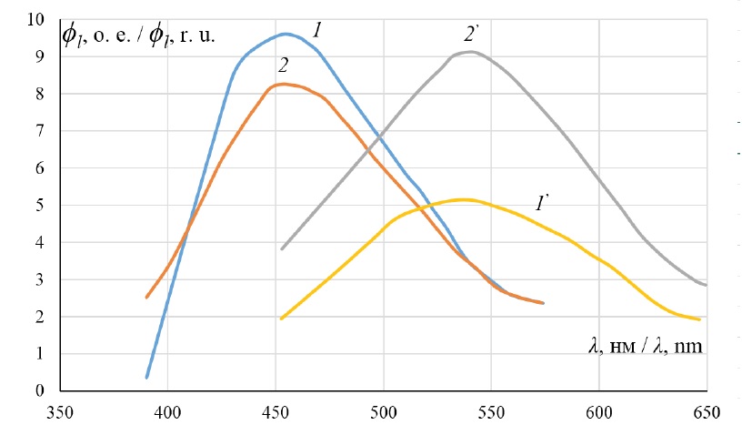 Fig. 2. The luminescence spectra of milky ripeness (1 and 1’) and fully ripe (2 and 2’) wheat seeds
