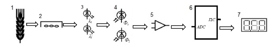 Fig. 7. The functional diagram of the method for determining the seed ripeness: 1 – the test material (seeds or ears);