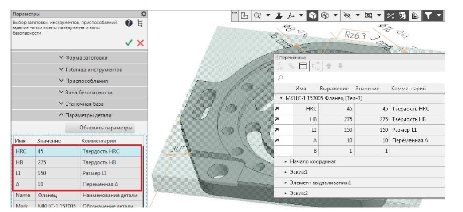 Сначала посредством API КОМПАС-3D извлекаются параметрические переменные. Чтобы переменные были доступны для CAM-системы, они должны быть предварительно объявлены со статусом «внешние». Переменные 3D-модели могут быть как геометрическими, то есть ассоциативно связанными с какими-либо объектами 3D-модели (например, с аннотациями или размерами эскиза), так и негеометрическими (например, свойства материала). Твердость материала (HB или HRC), предел прочности и иные параметры могут быть заданы конструктором или технологом как параметрические переменные детали, тогда они будут иметь приоритет над свойствами материала, хранящимися в справочнике материалов. Параметры выводятся на панель параметров CAM-системы, чтобы пользователь мог видеть, какие параметры детали можно применить в параметрических расчетах (рис. 6).