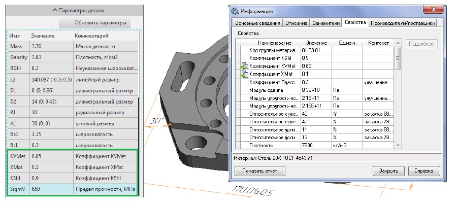 Для автоматического получения свойств материала реализована интеграция CAM-приложения с библиотекой «Материалы и Сортаменты» системы КОМПАС-3D. Из справочника автоматически извлекаются предел прочности σв, МПа (SigmaV), коэффициенты обрабатываемости KVMet и Xmat (рис. 8), твердость (HRC или HB).
