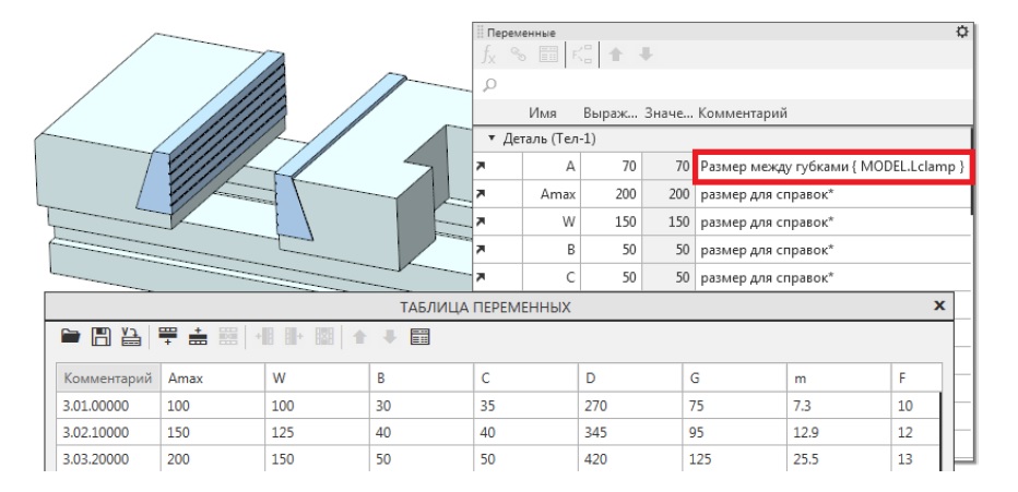Ниже на рисунках 9 и 10 показан пример автоматической настройки зажимного размера станочного приспособления. В системе КОМПАС-3D создается деталь в виде параллелепипеда (рис. 10). Ширине детали ставится в соответствие параметрическая переменная W. Для закрепления детали используются тиски фирмы GERARDI (рис. 9). Стандартные размеры тисков по каталогу GERARDI хранятся в таблице переменных 3D-модели, а зажимному размеру поставлен в соответствие параметр детали MODEL.Lclamp.
