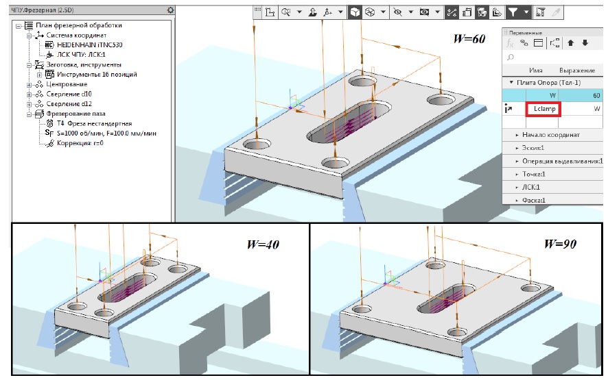 В модели обрабатываемой детали создается параметрическая переменная Lclamp, которая приравнивается переменной W. Таким способом устанавливается информационная связь между шириной детали W и зажимным размером тисков. При изменении значения переменной W модель детали перестраивается, изменяя свою ширину, при этом автоматически подгоняется размер между губками тисков. На рисунке 10 показаны деталь и тиски при W=60; 40 и 90 мм.
