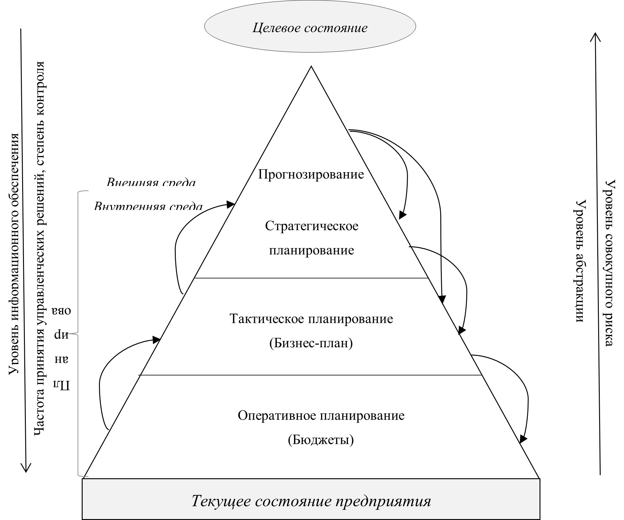 Как показано на рисунке, чем ниже, детальнее, уровень планирования, тем выше уровень информационного обеспечения (в том числе конкретизации, детализации данных), частота принятия управленческих решений и степень контроля. При этом степень абстракции и, как следствие, величина совокупного риска снижаются, а значит, уменьшается потребность в выработке альтернативных вариантов, сценариев развития событий. Прогнозный уровень характеризуется наибольшими уровнями совокупного риска и абстракции. Вместе с тем информационное обеспечение, возможности принятия управленческих решений, степень контроля ограничены.
