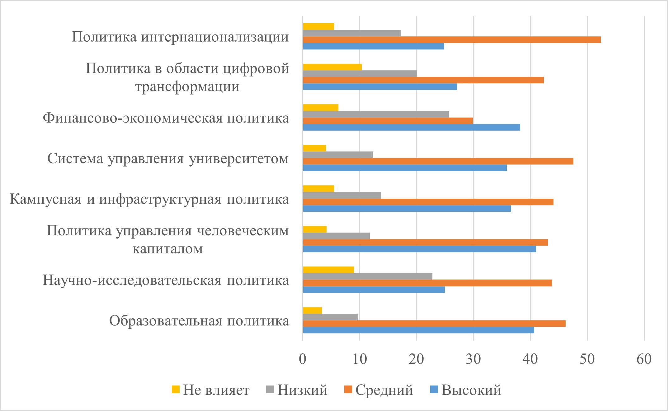 Анализируя данные, представленные на рис. 2, можно условно выделить три группы политик. Первая – с высокой степенью влияния. Так, наиболее высокую степень влияния отличают направления, связанные с образовательной политикой и политикой управления человеческим капиталом. Вторая группа – средняя степень влияния. В данной группе лидерами стали политики, направленные на совершенствование системы управления университетом и инфраструктурной деятельности. Наконец, третья группа – противоречивая. Здесь необходимо отметить финансово-экономическую политику, которая показала высокие результаты как по степени влияния, так и полного его отсутствия. По мнению авторов, данный факт свидетельствует о том, что управленческие команды вузов до сих пор не в полной мере осознают, каким образом молодежная политика может стать инструментом повышения финансовых показателей университета.
