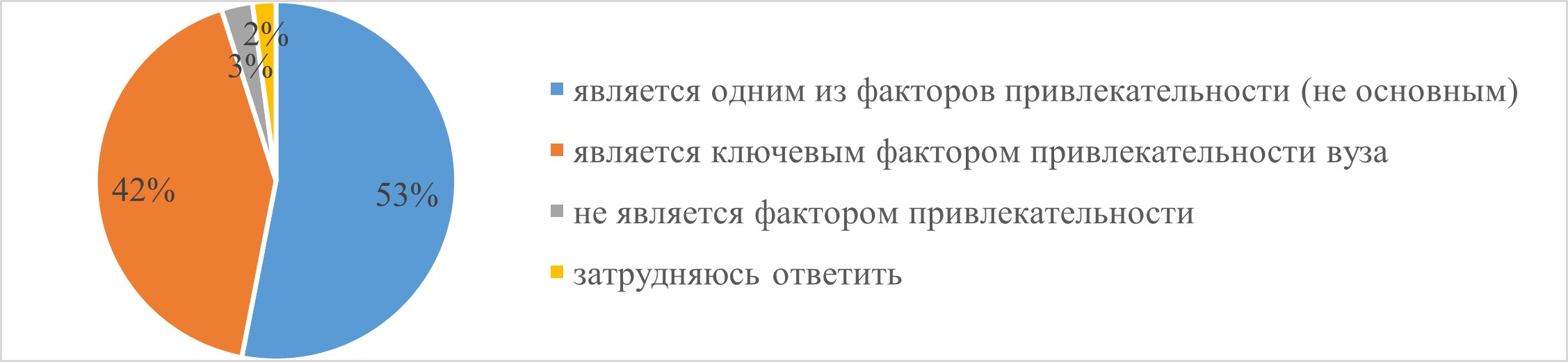 Если рассматривать молодежную политику как фактор влияния на привлекательность университета (рис. 3) во внешнем пространстве, обращаем внимание на тот факт, что подавляющее большинство заполнявших анкету (95 %) считают, что данное направление является одним из факторов или даже ключевым аспектом привлекательности вуза. Несомненно, на это нужно обратить внимание при выстраивании ориентированности приемной кампании, учитывать при работе с будущими абитуриентами, демонстрируя не только образовательные возможности образовательной организации, но и вариативность общественной жизни молодежных объединений.