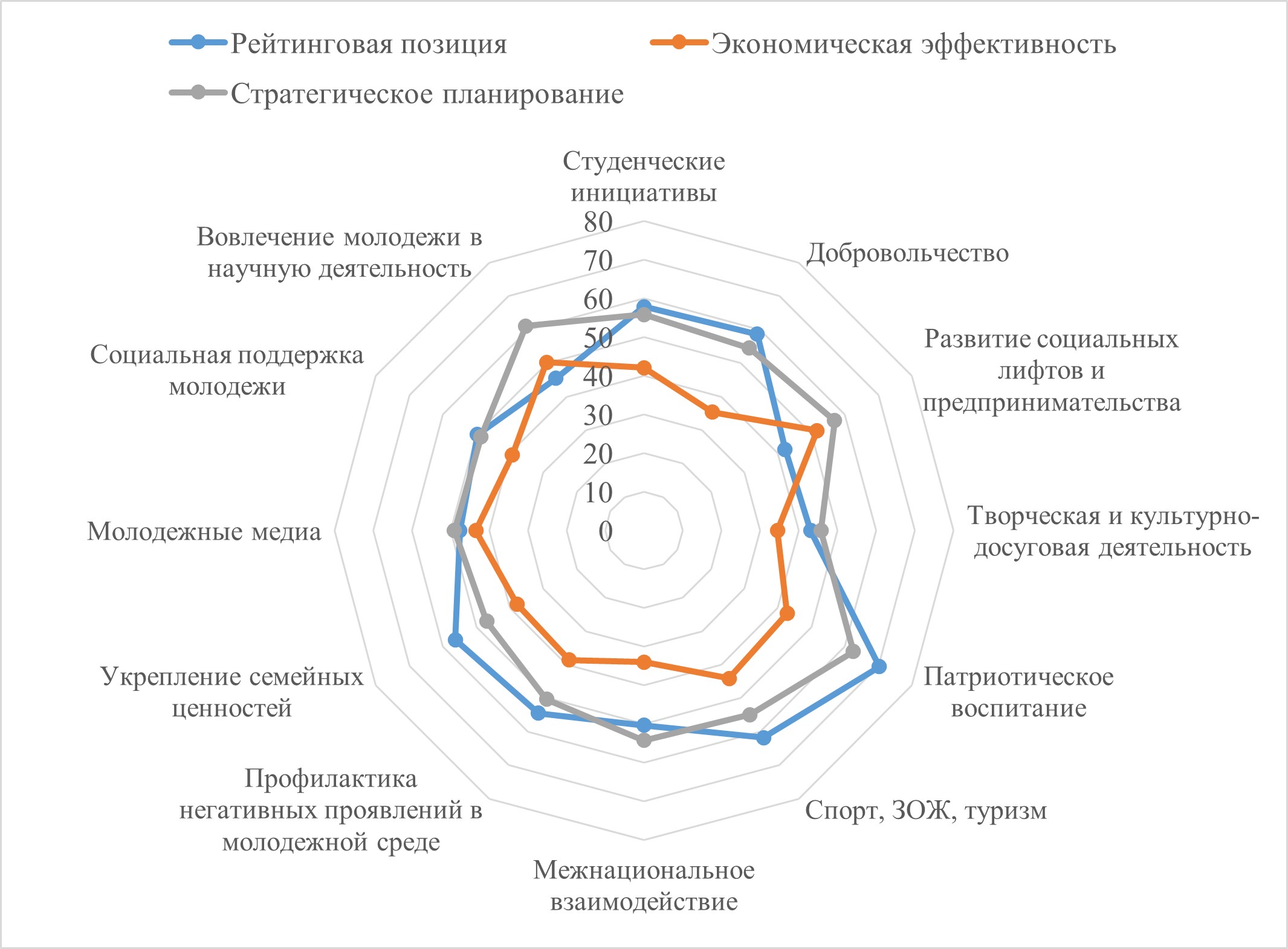 Анализируя далее рис. 5, отметим, что наиболее востребованными направлениями, по мнению прошедших опрос, с точки зрения повышения рейтинговых позиций вуза, являются патриотическое воспитание и развитие спорта. Среди векторов молодежной политики, влияющих на экономическую эффективность, лидерами стали направления, связанные с развитием социальных лифтов, молодежного предпринимательства, а также вовлечение молодежи в научную деятельность. Наконец, в рамках третьей группы, стратегического планирования, высокие результаты показали сферы молодежной науки и развития патриотизма. Одновременно исследование фиксирует следующую тенденцию: зачастую в каждой из трех рассмотренных групп направления-лидеры остаются одними и теми же, меняется лишь их ранг. Отметим их: патриотическое воспитание; спорт, ЗОЖ, туризм; вовлечение молодежи в научную деятельность; студенческие инициативы, развитие социальных лифтов и предпринимательства, добровольчество. Таким образом, можно сделать вывод, что имеющийся комплекс направлений, которые влияют на разные средовые условия деятельности университета, – та самая тенденция, когда развитие определенных сфер влияет на ключевые аспекты деятельности вуза.