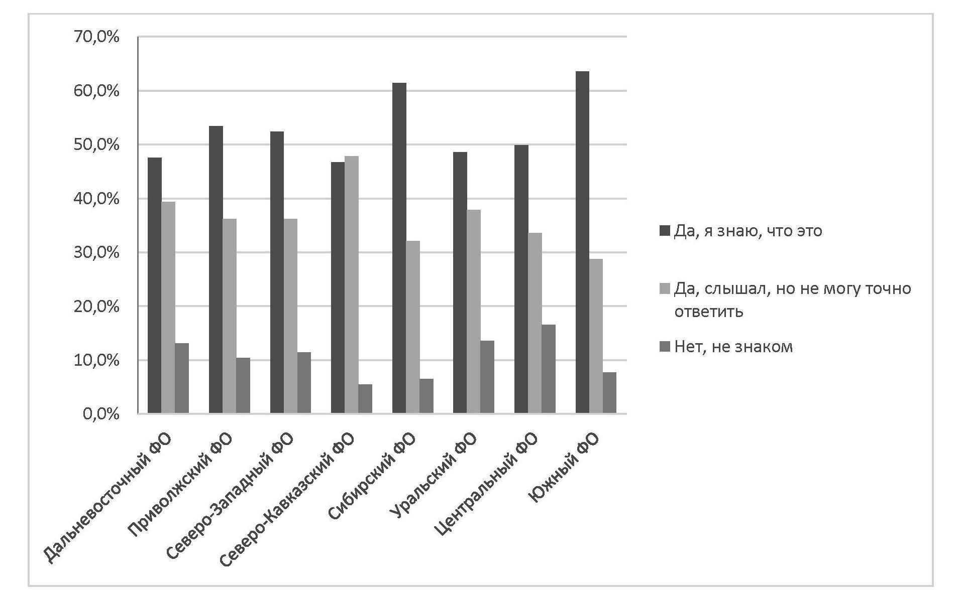 Рис. 2. Распределение ответов на вопрос «Знакомы ли Вы с термином “потребительская кооперация”?» (федеральные округа)