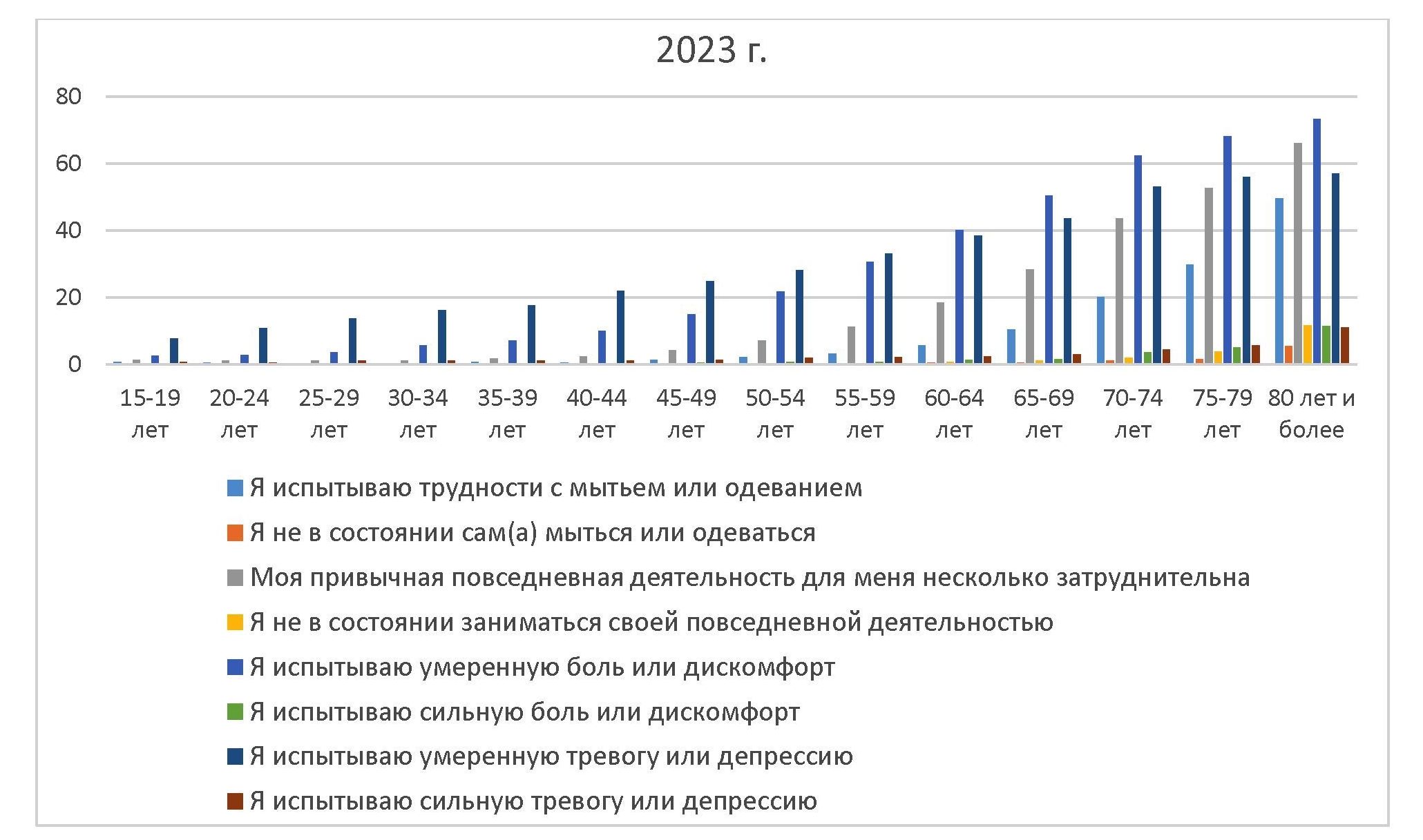 Однако закономерно, что способность трудиться определяется физическим и психоэмоциональным состоянием граждан. Так, после 60 лет около 40 % граждан, то есть почти каждый второй, испытывают умеренную боль или дискомфорт, а также умеренную тревогу или депрессию, а каждый пятый имеет трудности с обычной повседневной деятельностью. После 65 лет у почти каждого третьего возникают трудности в повседневной деятельности, а после 70 лет – уже у каждого второго (рис. 1).