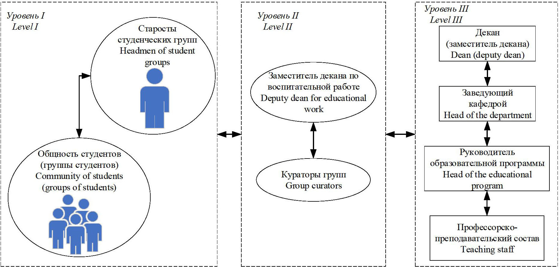 - студент−декан (заместитель декана)/заведующий кафедрой/руководитель образовательной программы/профессорско-преподавательский состав, где акцентируется внимание на освоении профессиональных компетенций и системе мониторинга/контроля над обучающимися в рамках образовательного процесса.