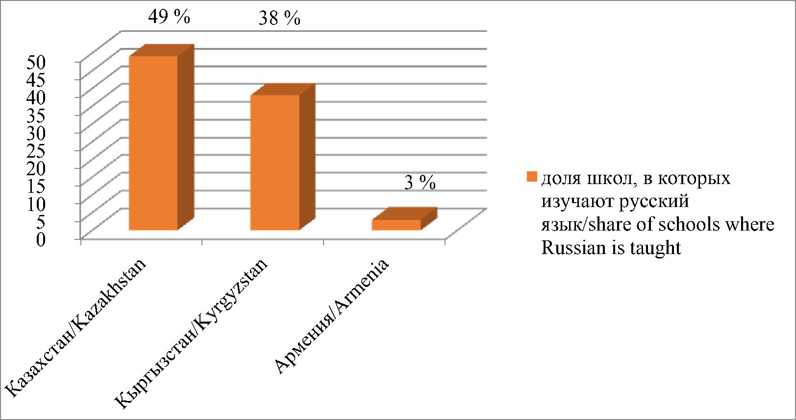 Наиболее благоприятные условия для изучения русского языка созданы в Казахстане, где обучение доступно практически в половине всех школ. Несколько сложнее найти школу с преподаванием русского языка в Кыргызстане и очень проблематично − в Армении, где только 3 % средних общеобразовательных организаций республики готовы предоставить такую услугу (рис. 3).