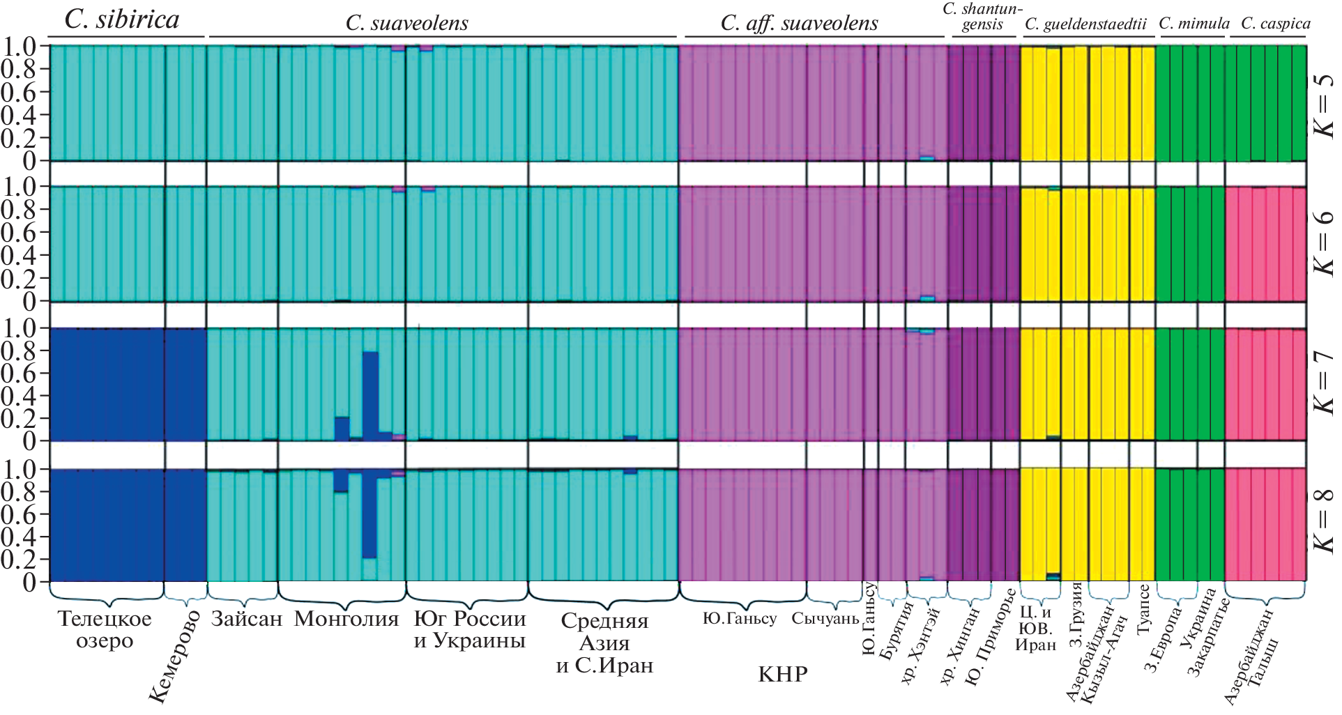 - Pritchard J.K., Stephens M., Donnelly P. Inference of population structure using multilocus genotype data // Genetics. 2000. V. 155. № 2. P. 945–959.