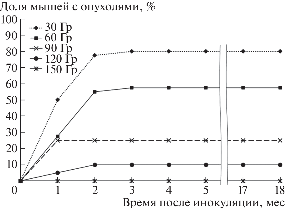 Представлены данные исследования скорости роста и частоты индукции солидной формы асцитной карциномы Эрлиха (АКЭ) у мышей в короткие и отдаленные сроки после инокуляции асцитных клеток, облученных ex vivo пучком протонов в диапазоне доз 30–150 Гр. Было показано, что скорость роста солидной опухоли, после инокуляции облученных клеток ex vivo совпадала с ростом опухолей контрольной группы. Частота индукции опухолей у мышей с перевитыми клетками АКЭ, облученными в дозе 30 Гр, составила 80%, 60 Гр – 60%, 90 Гр – 25%, 120 Гр – 10%, а при облучении в дозе 150 Гр в течение всего периода наблюдения опухоли не появилась. Таким образом, нам удалось определить дозу протонного излучения, необходимую для элиминации опухолевых клеток и/или сигнальных факторов, способных привести к индукции роста солидной АКЭ у мышей.