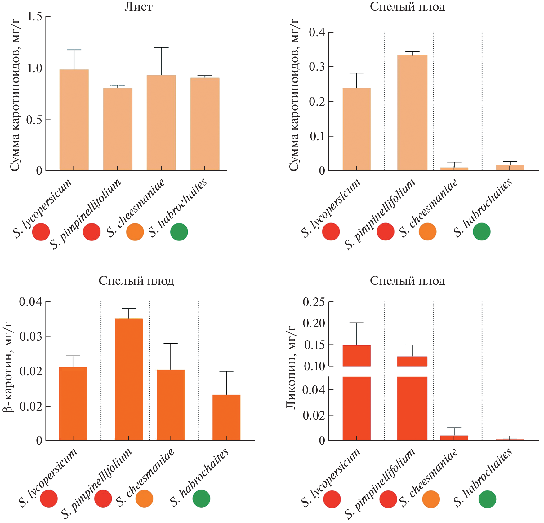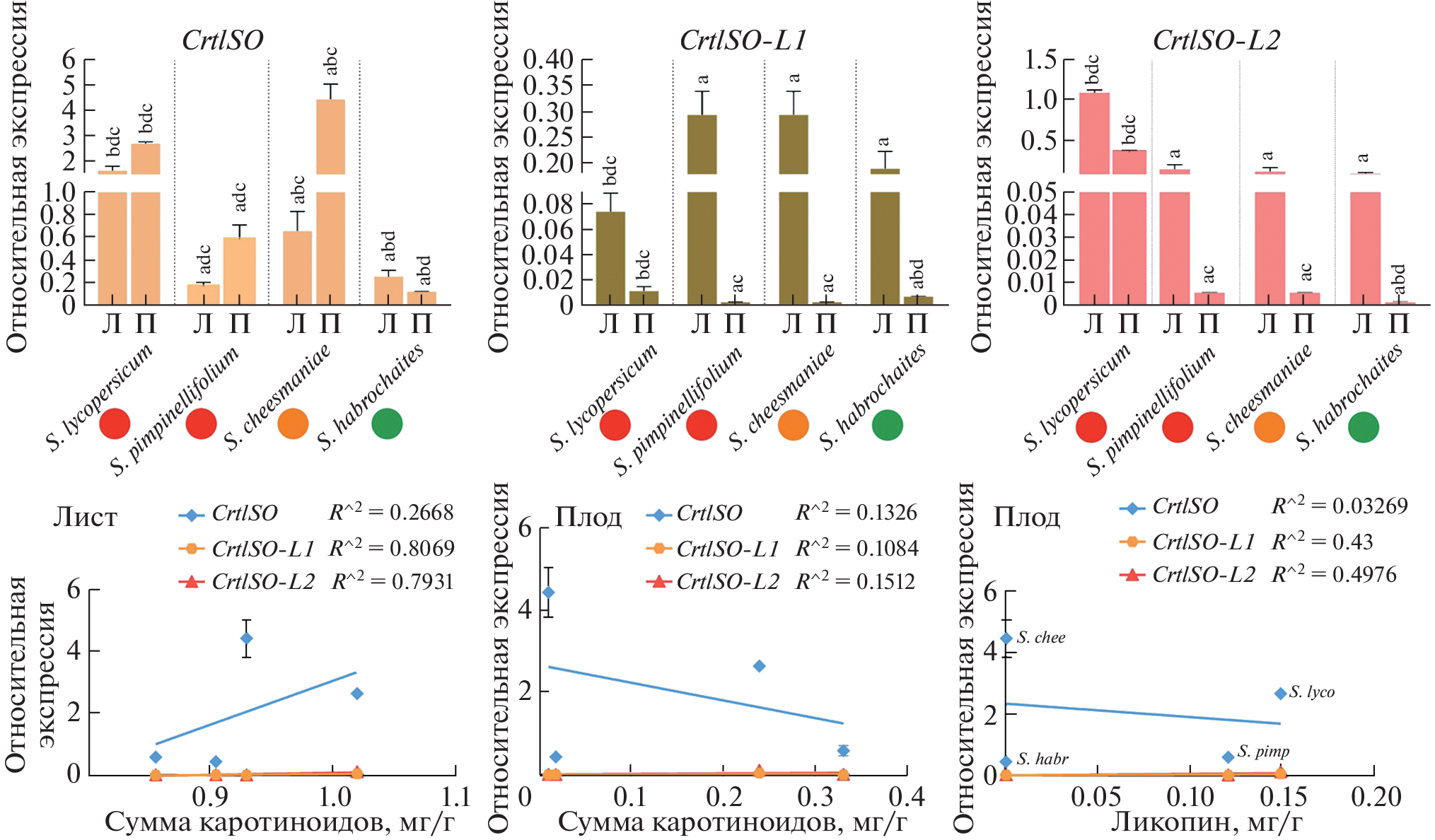 The expression of the genes of carotenoid-cis-trans isomerases CrtISO, CrtISO-L1 and CrtISO-L2 was studied in comparison with the content of carotenoids in tomato species with different ripe fruit colors: green (Solanum habrochaites), yellow (S. cheesmaniae) and red (S. pimpinellifolium and S. lycopersicum). More ancient origin of CrtISO-L2 was shown in relation to CrtISO and CrtISO-L1. A similar content of total carotenoids (leaves) and β-carotene (ripe fruits) was found between the samples. Unlike fruits of S. habrochaites and S. cheesmaniae, red fruits accumulated lycopene and 20-30 times more total carotenoids. The highest level of transcripts both in leaves and in ripe fruits was detected for CrtISO. The CrtISO-L1 and CrtISO-L2 were transcribed high in leaves and low in fruits, except for the high expression of CrtISO-L2 in S. lycopersicum fruits. No relationship was observed between the content of carotenoids and the level of gene expression in the fruit. In the leaves, a positive correlation between the amount of carotenoids and the levels of CrtISO-L1 and CrtISO-L2 transcripts was found.