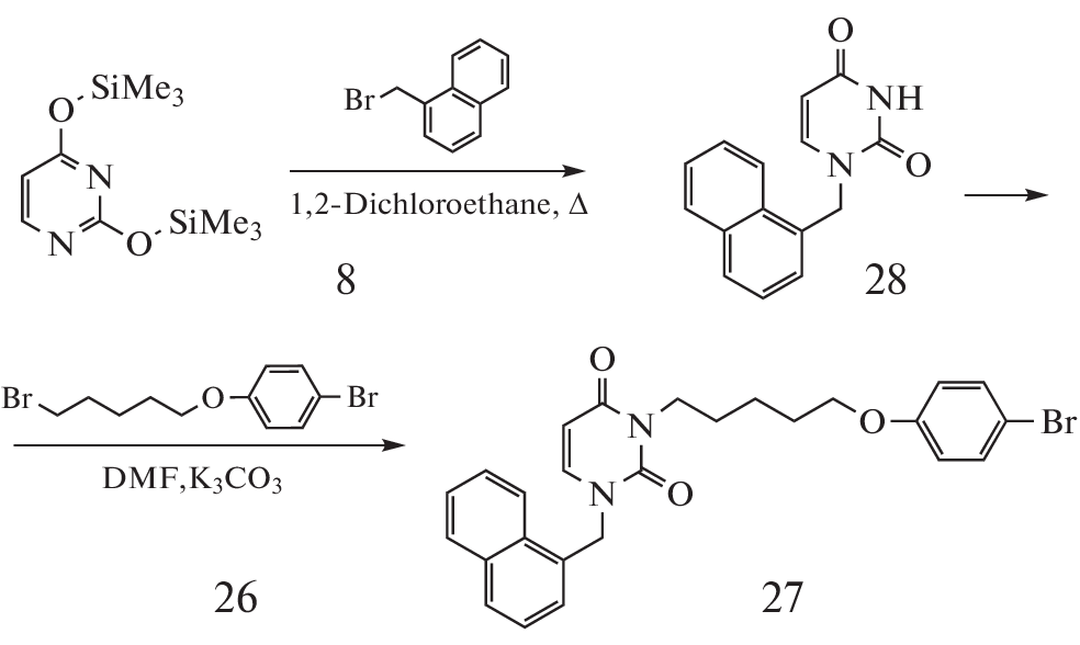 A new series of 1-[ω-(bromophenoxy) has been synthesizedalkyl]-uracil derivatives containing naphthalene-1-yl-, naphthalene-2-yl-, 1-brominaphthalene-2-ilmethyl, benzyl and anthracene-9-ilmethyl fragments in position 3 of uracil. Antiviral properties of synthesized compounds against human cytomegalovirus were studied. It was found that the compound, which has a bridge consisting of five methylene groups, has high anti-cytomegalovirus activity in vitro. uracil