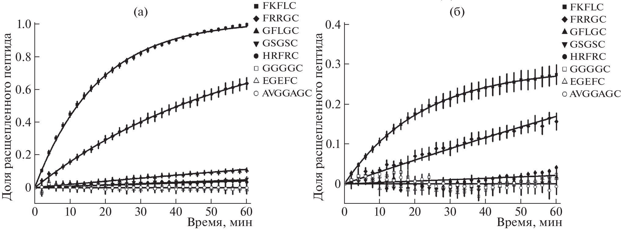На основании известных литературных данных были выбраны шесть пептидных последовательностей, которые потенциально способны быстро расщепляться эндосомной протеазой катепсином В. Для сравнения изучалось также расщепление катепсином В распространенных линкерных последовательностей – полиглицина и полиглицин-серина. Разные концы данных пептидов были помечены флуоресцентными красителями sulfoCyanine3 и sulfoCyanine5, между которыми возможен резонансный перенос энергии по Фёрстеру (FRET). Кинетика расщепления пептидов катепсином В изучалась на мультимодальном плашечном ридере по уменьшению сигнала FRET. Было показано, что для потенциального использования в различных системах доставки лекарств наиболее подходящими являются сайты расщепления FKFL и FRRG. Данные сайты значительно эффективнее расщепляются в слабокислых условиях эндосом, чем при нейтральных значениях рН, характерных для внеклеточной среды.