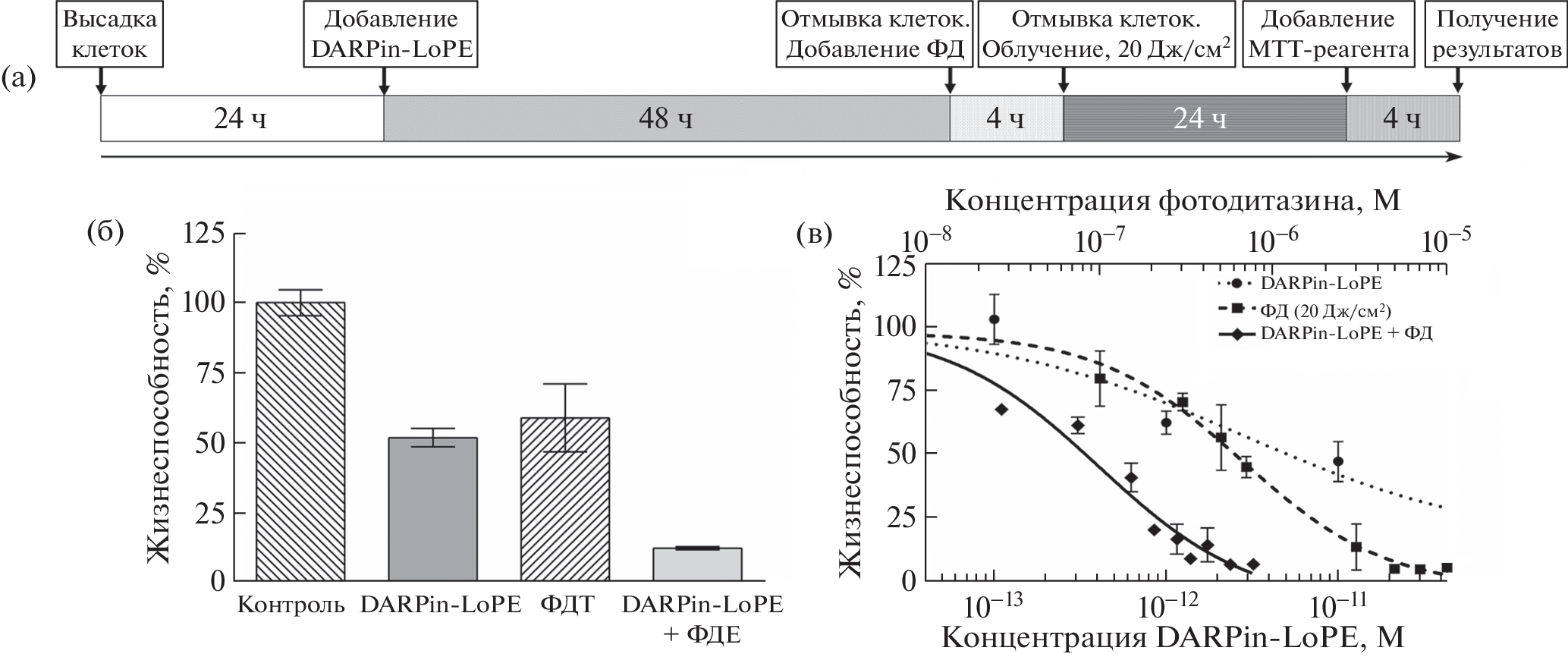 Перспективной стратегией по повышению эффективности противоопухолевой терапии является разработка комбинированных схем лечения онкологических заболеваний. В работе показана принципиальная возможность многократного усиления противоопухолевого действия при комбинировании таргетной и фотодинамической терапии. Продемонстрировано, что последовательная обработка клеток HER-2 положительного рака молочной железы таргетным токсином DARPin-LoPE и фотоактивным соединением фотодитазином приводит к многократному синергическому усилению их эффекта. В перспективе такой подход призван обеспечить достижение максимального терапевтического эффекта при минимизации рисков негативных побочных эффектов.