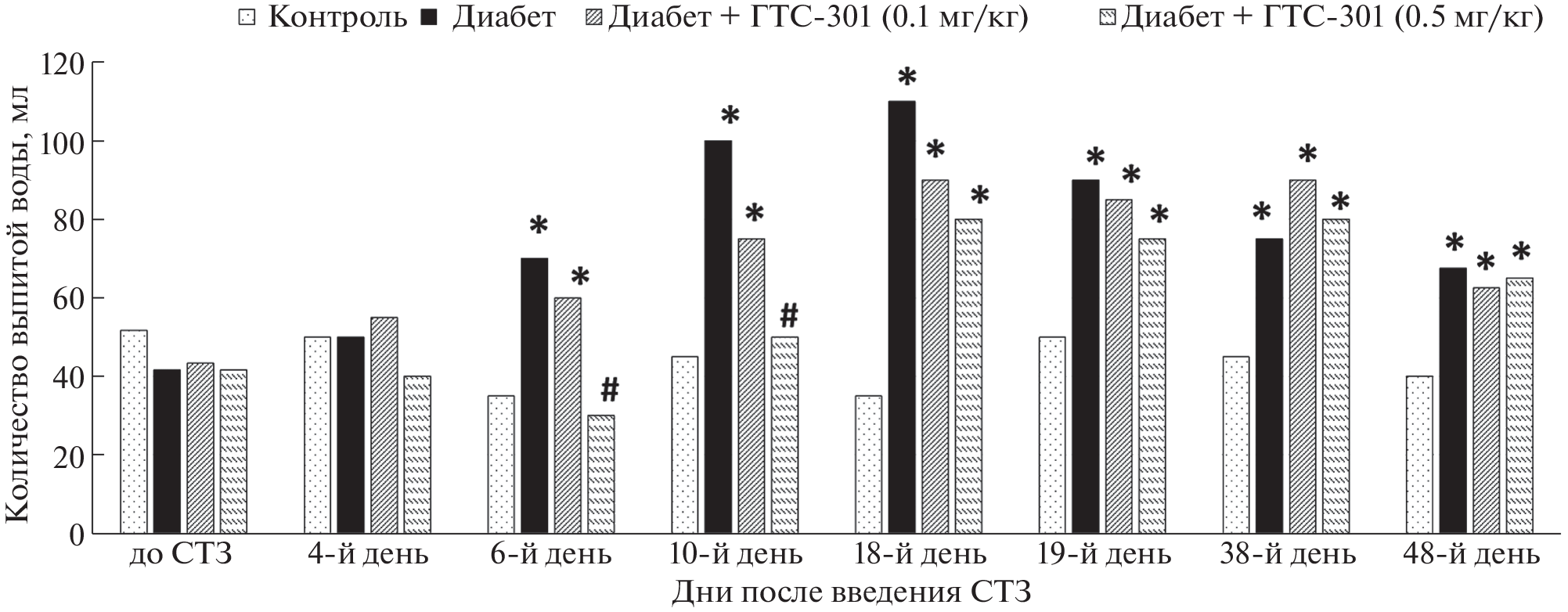 Ранее установлено, что оригинальный дипептидный миметик 4-й петли NT-3 гексаметилендиамид бис-(N-моносукцинил-L-аспарагинил-L-аспарагина) (ГТС-301) обладает выраженным нейропротективным эффектом in vitro в концентрациях 10–5–10–12 М. В настоящем исследовании в экспериментах на стрептозотоциновой модели диабета у мышей линии C57Bl/6 установлено, что ГТС-301 при 32-дневном внутрибрюшинном введении в дозах 0.1 и 0.5 мг/кг обладает антидиабетической активностью по показателям снижения гипергликемии, полидипсии и увеличения выживаемости животных. Полученные результаты подтверждают концепцию сходства нейрохимических механизмов регуляции функций нейронов и β-клеток.