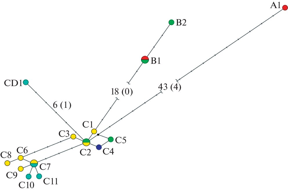Генетические особенности орибатид вида Ameronothrus nigrofemoratus, обитающих циркумполярно на побережье арктических морей, до настоящего времени были известны только для клещей с территории Канады. Изучение частичной последовательности COI мтДНК особей, соответствующих данному виду по морфологическим признакам, показало, что на о. Колгуев совместно обитают клещи, относящиеся к двум сильно дивергировавшим филогенетическим линиям (7%), ни одна из которых на побережье Канады не обнаружена. Аминокислотная последовательность цитохромоксидазы I представителей одной из линий имеет четыре замены по сравнению с последовательностью североамериканских A. nigrofemoratus, что соответствует уровню различий между A. nigrofemoratus и сестринским видом A. lineatus.