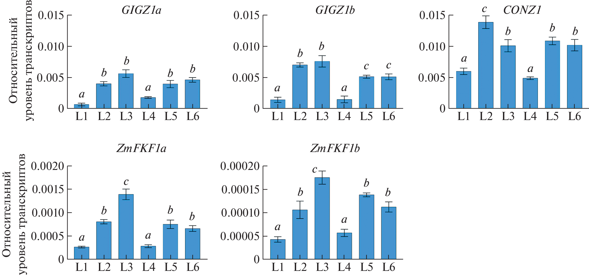 Охарактеризовано 20 инбредных линий кукурузы Zea mays L. по длительности фенофаз, включая сроки цветения и спелости. Исследована экспрессия ключевых генов инициации цветения, CONZ1, GIGZ1a, GIGZ1b, ZmFKF1a и ZmFKF1b, в проростках шести линий кукурузы, различающихся сроками спелости, в условиях длинного фотопериода. Выявлен существенно более низкий уровень транскриптов всех пяти генов у раннеспелых линий в сравнении с позднеспелыми образцами. Показана сходная экспрессия паралогичных генов GIGZ1a и GIGZ1b, а также значительное преобладание экспрессии ZmFKF1a в сопоставлении с паралогичным ему геном ZmFKF1b.