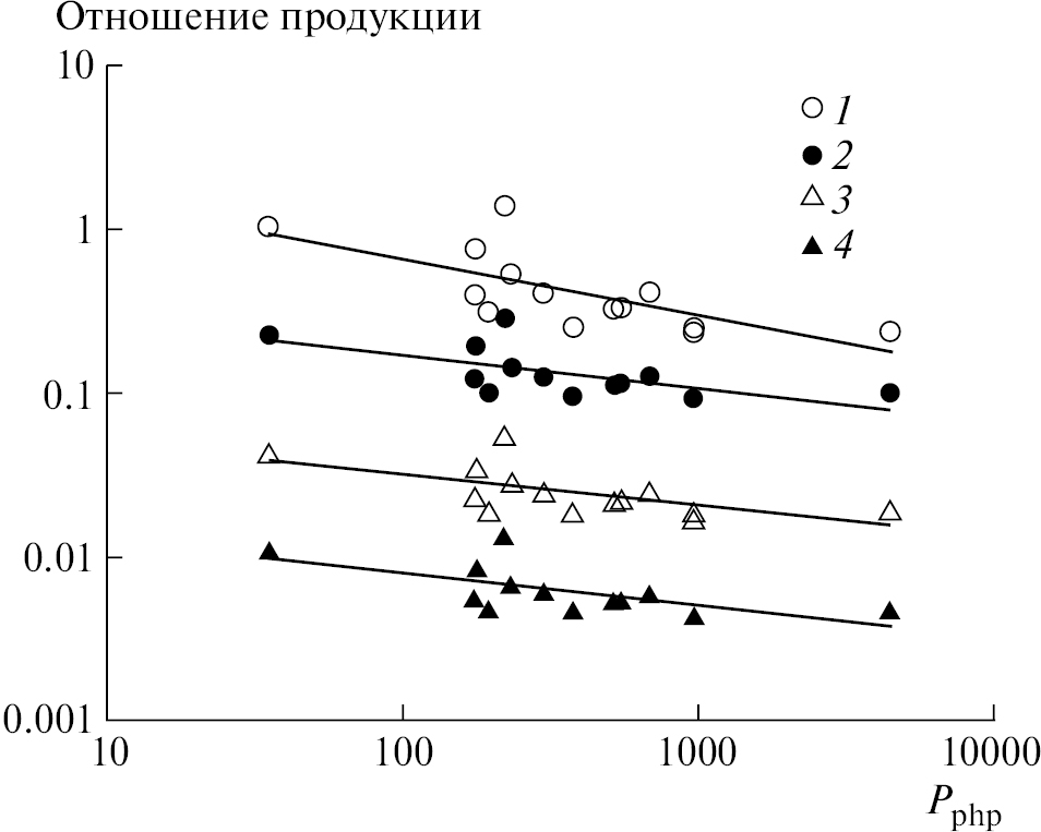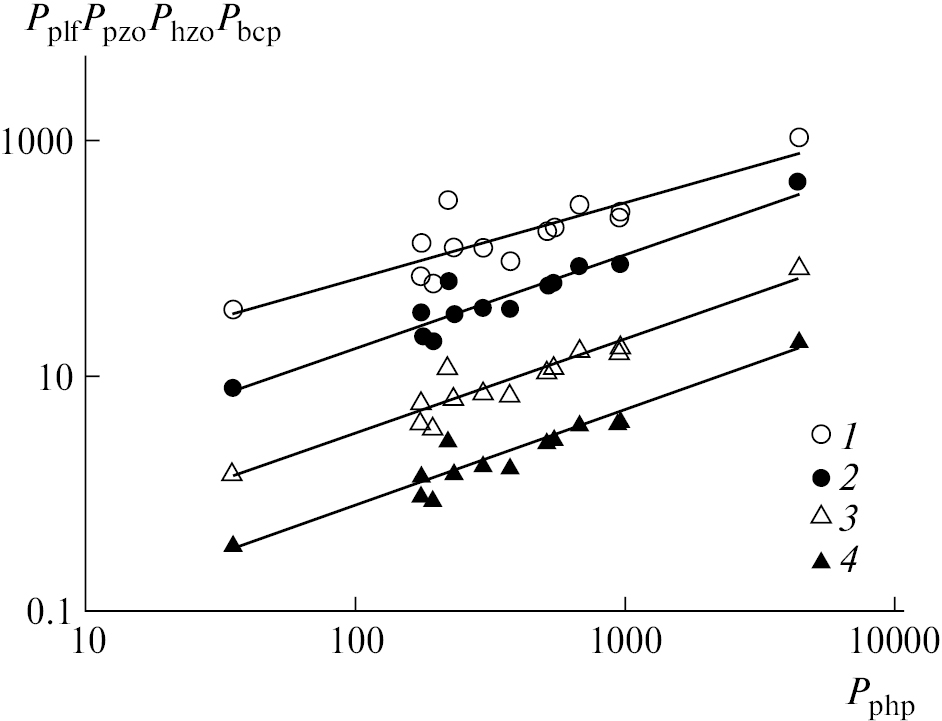 Рис. 2. Отношение Pbcp/Pphp (1), Phzo/Pphp (2), Ppzo/Pphp (3) и Pplf/Pphp (4) в зависимости от величины Pphp