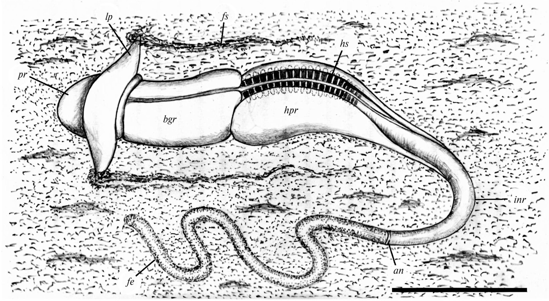 Рис. 1. Питающаяся Quatuoralisia malakhovi на поверхности осадка; рисунок на основе подводных фотографий. Масштаб: 5 см. an – анус; bgr – бранхиогенитальный подотдел туловища; fe – фекальный шнур; fs – борозды в осадке, оставляемые латеральными воротниковыми губами; hpr – печеночный подотдел туловища; hs – печеночные дивертикулы; inr – кишечный подотдел туловища; lp – латеральные воротниковые губы; pr – хобот.
