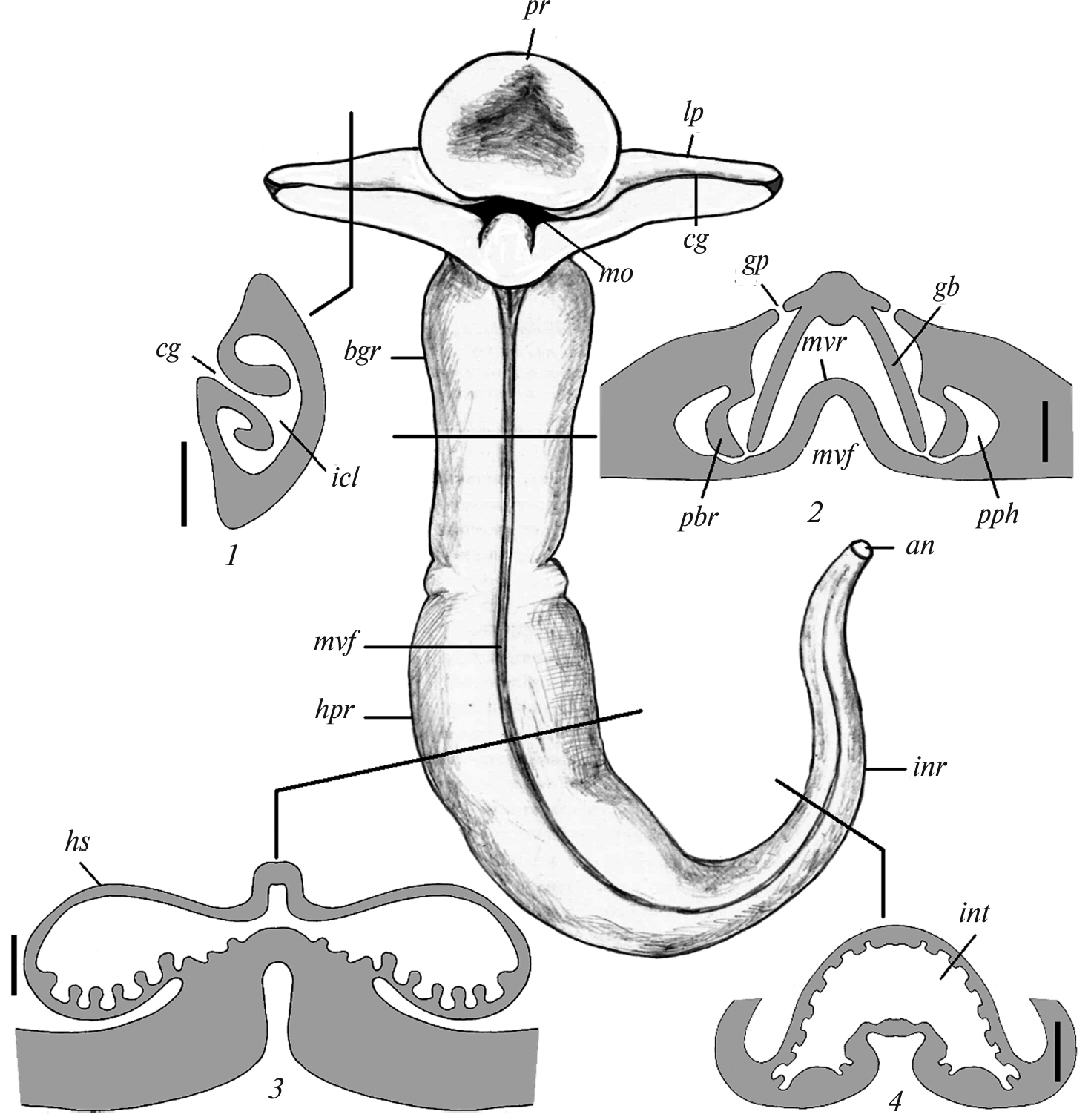 Рис. 2. Внешний вид Quatuoralisia malakhovi с вентральной стороны и схемы поперечных срезов на соответствующих уровнях (1 – через латеральную воротниковую губу, 2 – через бранхиогенитальный подотдел туловища, 3 – через печеночный подотдел туловища, 4 – через кишечный подотдел туловища). Масштаб: 1 мм. cg – ресничная борозда на латеральных воротниковых губах; gb – жаберные перегородки; gp – жаберные поры; icl – внутренний канал в латеральных воротниковых губах; int – кишка; pph – периферические глоточные каналы; mo – рот; mvf – мидвентральная борозда; mvr – мидвентральный гребень; pbr – парабранхиальные гребни. Остальные обозначения на рис. 1.