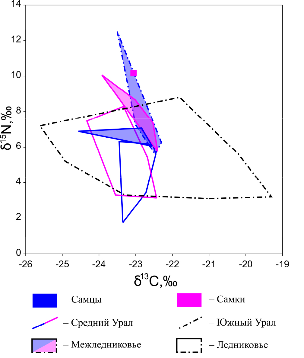 Средние значения δ13С и δ15N в группах самцов и самок на Среднем Урале в межледниковье различаются на 0.6 ‰ и на 1.0 ‰, в ледниковье – на 0.3 ‰ и 0.2 ‰ соответсвенно (табл. 1). Различие средних значений δ13С и δ15N межледникового и ледникового времени между самцами составляют 0.4 ‰ и 1.4 ‰, между самками – 0.3 ‰ и 2.2 ‰. Между объединенными выборками самцов и самок в значениях δ13С различий нет, а значения δ15N различаются на 2.0 ‰. На Южном Урале различия значений δ13С и δ15N можно оценить только для объединенных выборок самцов и самок межледниковья и ледниковья (табл. 1). Эти различия составляют для δ13С 0.8 ‰, для δ15N – 3.2 ‰ (табл. 1). Географические различия значений δ13С и δ15N в межледниковье между самцами Среднего и Южного Урала составляли 0.5 ‰ и 1.3 ‰, а между объединенными выборками самцов и самок – соответственно 0.2 ‰ и 1.1 ‰. В ледниковье различия значений δ13С и δ15N между объединенными выборками самцов и самок малого пещерного медведя Среднего и Южного Урала составляли соответственно 1.0 ‰ и 0.1 ‰.