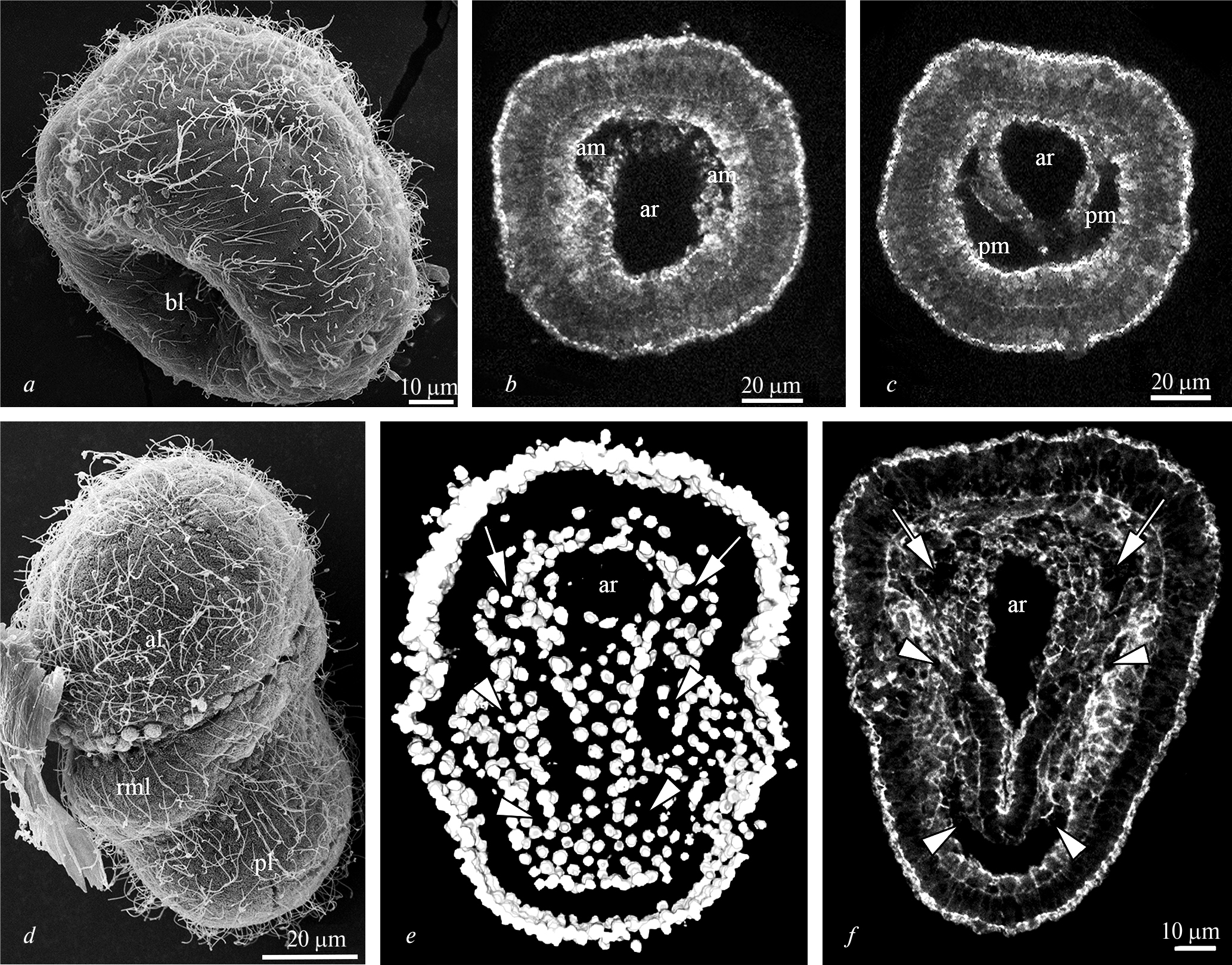 Рис. 1. Формирование мезодермы у личинки брахиоподы Coptothyris grayi: (а) – поздняя билатерально симметричная гаструла (15 чпо), СЭМ, (б) – формирование передней мезодермы на стадии поздней гаструлы, частичная Z-проекция части после окраски DAPI, КЛСМ, (в) – формирование задней мезодермы на стадии поздней гаструлы, частичная Z-проекция после окраски DAPI, КЛСМ, (г) – ранняя трехлопастная личинка (22 чпо), СЭМ, (д) – Z-проекция ранней трехлопастной личинки после окраски DAPI, КЛСМ, (е) – Z-проекция ранней трехлопастной личинки после окраски фаллоидином, КЛСМ. (al) – головная лопасть, (am) – передняя мезодерма, (ar) – архентерон, (bl) – бластопор, (pl) – ножная лопасть, (pm) – задняя мезодерма, (rml) – зачаток мантийной лопасти, стрелки указывают на переднюю мезодерму, наконечники стрелок указывают на заднюю мезодерму.