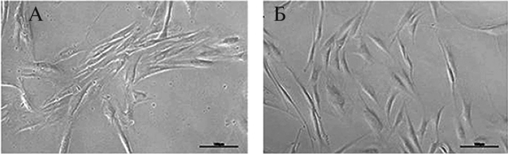 Рис. 1. Микрофотографии дермальных фибробластов человека in vitro. (а) Фибробласты линии DF1 (получены от здорового донора) и (б) линии HDDF (получены от донора с болезнью Хантингтона). Фазово-контрастная микроскопия, х10. Масштаб 100 мкм.