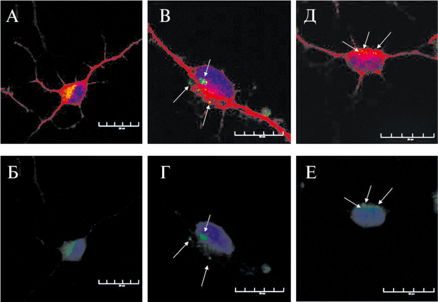 Рис. 3. Визуализация белка хантингтина (зеленый) в нейронах стриатума, полученных методом прямого репрограммирования из дермальных фибробластов: (а и б) клеток линии DF1 (здоровый донор) и (в, г, д, е) из клеток линии HDDF (донор с болезнью Хантингтона). Показан результат иммунофлуоресцентного окрашивания антителами к нейрональному маркеру MAP2 (вторичные антитела конъюгированы с Alexa 555) и антителами к хантингтину mEM48 (вторичные антитела Alexa 488). Ко-локализация этих двух белков проявляется в желтом окрашивании. Ядра клеток визуализированы красителем DAPI (синий). Конфокальная микроскопия, х60. Масштаб 30 мкм. В нейро- нах стриатума, полученных из дермальных фибробластов здорового донора, хантингтин в цитоплазме распределен диффузно (а и б), в то время как в нейронах стриатума, полученных из дермальных фибробластов пациента с болезнью Хантингтона, наблюдаются агрегаты этого белка (показаны стрелками) (в, г, д и е).