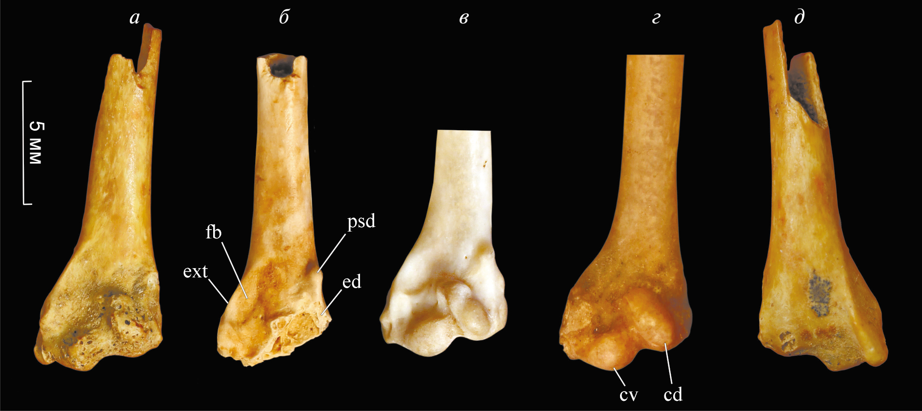 Рис. 2. Дистальная часть плечевой кости Turnix sp. из нижнего плейстоцена пещеры Таврида в сравнении с ископаемыми и современными Turnicidae: а, д – экз. ПИН, № 5644/1777, Turnix sp.; пещера Таврида, Крым, нижний плейстоцен; б – Turnicidae gen. indet., экз. Национального научно-природоведческого музея, Киев, NMNHU-P Eg‑2–02; местонахождение Егоровка‑2, Одесская обл., Украина; верхний миоцен; в – Turnix tanki Blyth, 1843, остеологическая коллекция ПИН, экз. 53–5–1, современный; г – Turnix ocellatus (Scopoli, 1786), экз. Национального музея естественной истории, Париж, MNHN 1884–2466, современный; а–г – с краниальной стороны; д – с каудальной стороны. Обозначения: cd – дорсальный мыщелок; cv – вентральный мыщелок; ed – дорсальный надмыщелок; fb – fossa m. brachialis, ext –дистальное расширение; psd – дорсальный надмыщелковый отросток.
