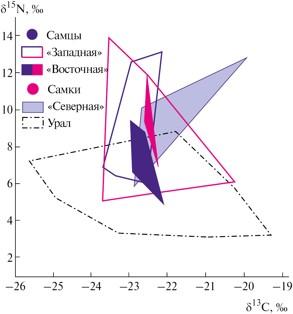 Анализ распределения значений δ13С и δ15N показывает, что в «восточной» выборке их значения у самок и самцов не перекрываются (рис. 1). Распределение значений δ13С и δ15N у самцов из «северной» и «западной» выборок перекрываются незначительно. Значительно перекрываются распределения значений δ13С и δ15N у самцов и самок из «западной» и «восточной» выборок и самцов из «северной» выборки (рис. 1). Это свидетельствует о заметных трофических сдвигах между самцами и самками в «восточной» выборке и между самцами из «северной» и «западной» выборок.