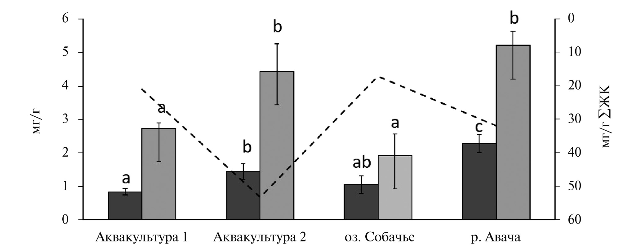 Однако фактор питания, вероятно, не повлиял на содержание ценных омега-3 ПНЖК на единицу массы мышечной ткани исследуемой молоди. Голец из двух аквакультурных хозяйств содержал 3.5 ± 0.3 и 5.5 ± 1.1 мг/г сырой массы ЭПК + ДГК, тогда как голец из оз. Собачье – около 3.0 ± 0.6 мг/г, а проходной голец из р. Авача – 7.5 ± 0.9 мг/г ЭПК+ДГК (рис. 2). Выявленные отличия не всегда были достоверны. Вероятно, содержание ЭПК и ДГК в данном случае не отражало характер питания, а было связано с накоплением общих липидов в мышечной ткани. Подобная тенденция была отмечена для половозрелых гольцов разных форм [2]. Кроме того, полученные данные говорят о высоком, и даже близком ко взрослым особям, содержании у неполовозрелых гольцов ЭПК и ДГК.