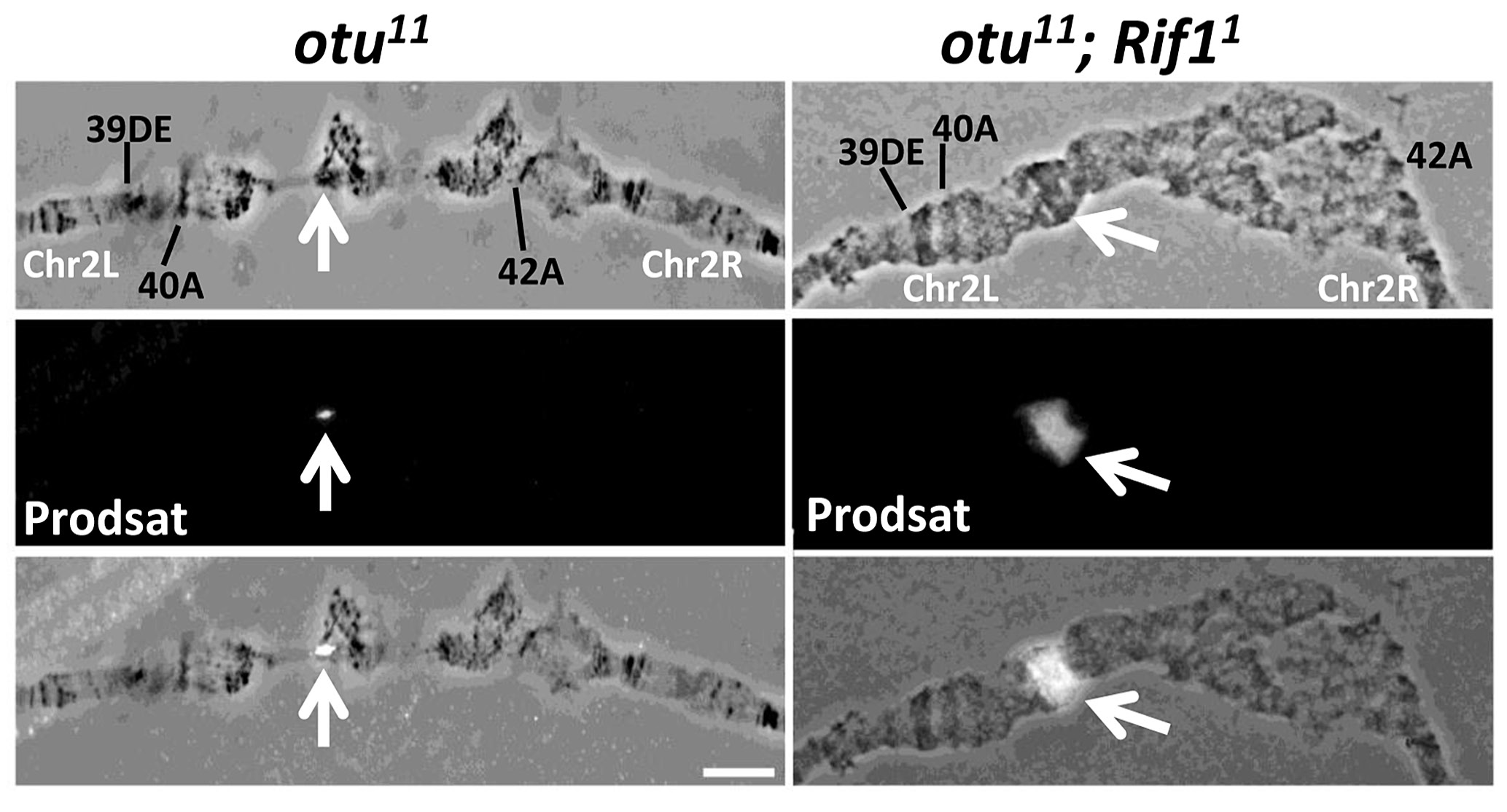 Ранее мы показали, что в СЖ такое изменение морфологии связано с политенизацией сателлитной ДНК. Для проверки влияния мутации Rif11 на политенизацию сателлитной ДНК в ППК мы провели in situ гибридизацию (FISH) с зондом к сателлиту Prodsat (AATAACATAG), занимающему протяженные участки гетерохроматина в хромосомах 2L и 3R вблизи центромер [12]. Ранее политенизация этого сателлита на фоне мутации Rif11 была нами показана в политенных хромосомах СЖ [4]. Чтобы добиться наилучшей морфологии хромосом на препаратах для FISH из ППК, мы разработали новый подход приготовления препаратов, включающий дополнительную окраску хромосом ацетоорсеином. На первом этапе препараты хромосом готовили по схеме, описанной выше. Затем препараты прогревали на настольном термостате при 70°С 10 с для лучшего прикрепления хромосом к стеклу, фотографировали хромосомы при помощи фазово-контрастного микроскопа, после чего препараты замораживали в жидком азоте, скалывали покровное стекло, дофиксировали и хранили в 96%-й этаноле при температуре –18 °С. В хромосомах ППК мутантов otu11; Rif11 наблюдалось резкое усиление сигнала FISH Prodsat по сравнению с otu11 (рис. 2). В ППК одиночных мутантов otu11, несмотря на то что там проходит несколько раундов полной репликации генома, этот сателлит представлен лишь маленькой точкой.