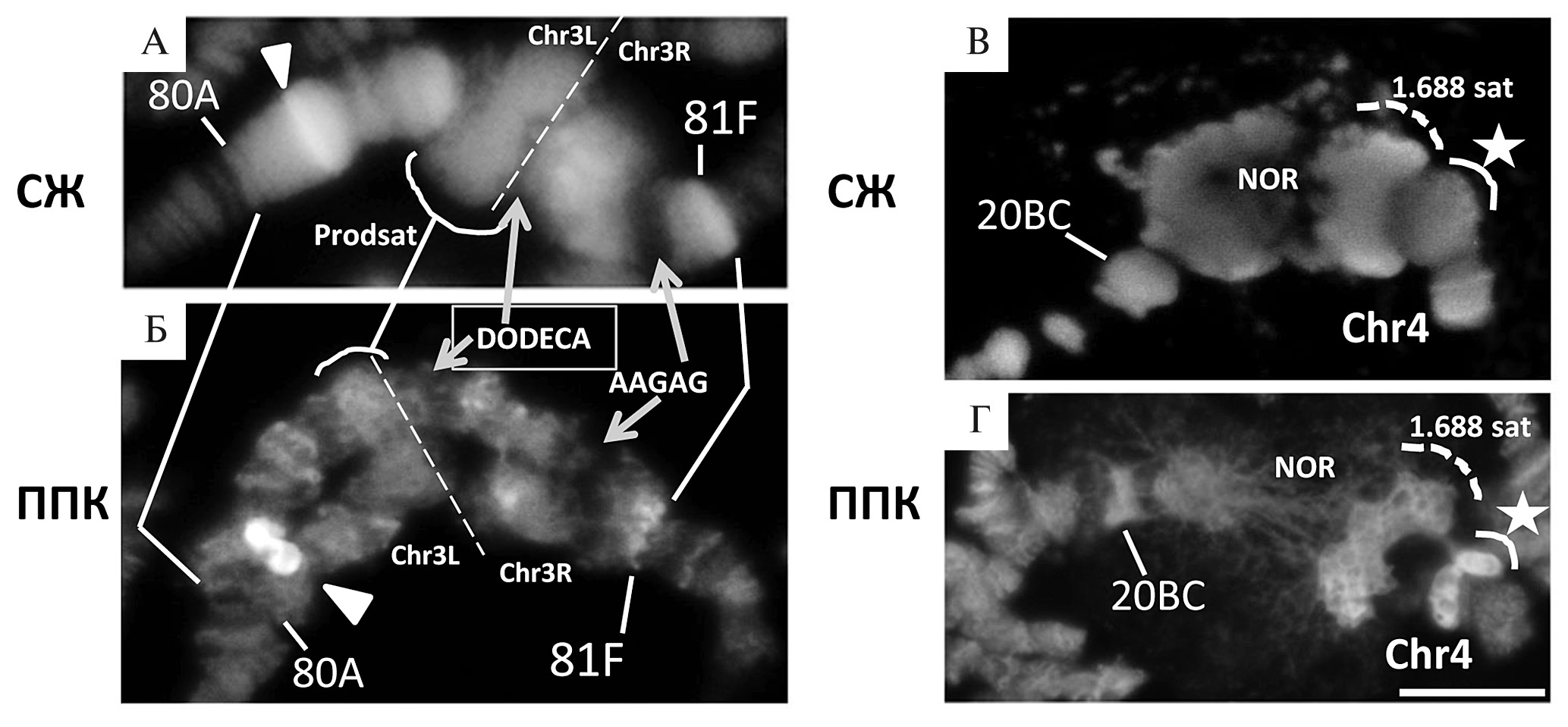 Рис. 3. Окрашенные DAPI прицентромерные районы хромосомы 3 в политенных хромосомах СЖ (А) и ППК (Б) на фоне мутации Rif11. Участок, ограниченный районами 80А и 81F, соответствует митотическому гетерохроматину хромосомы 3. Стрелками и линиями показаны районы, имеющие сходную морфологию в двух типах клеток, а также указан предполагаемый состав ДНК для некоторых районов согласно [4]. Белый треугольник указывает на DAPI-позитивный блок, соответствующий блоку h48 карты митотического гетерохроматина. Скобкой выделено положение сателлита Prodsat, фланкирующего центромеру хромосомы 3. Приблизительное положение центромеры указано пунктирной линией, пересекающей хромосому в соответствии с [4] для политенных хромосом СЖ и по сходству морфологии соответствующих районов в ППК. В.Г. Объединенные прицентромерные районы политенных хромосом Х и 4 в СЖ (В) и ППК (Г). Окрашивание – DAPI, масштаб – 10 мкм.
